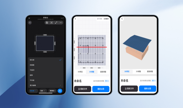 AI驱动的户用光伏智能设计工具支持阳光房、平改坡、斜/平屋面、庭院等多场景定制方案。